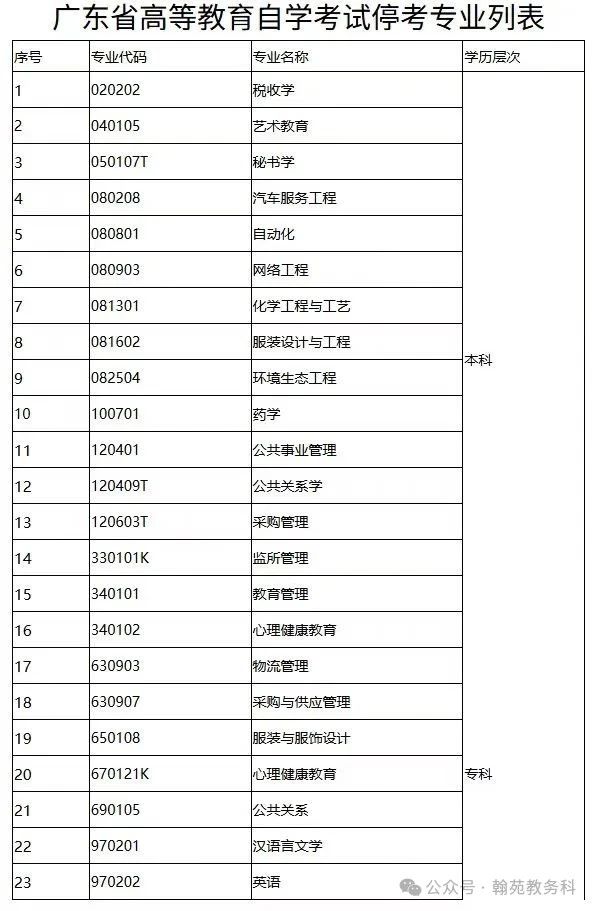 根据《关于停考我省高等教育自学考试税收学等23个专业的通知》(粤考委〔2022〕2号)规定,广东省23个停考专业毕业手续办理至2025年12月,2026年起停考专业不再受理毕业申请。 近期,有部分停考专业的考生反映,由于2022年10月考试尚在新冠病毒感染疫情期间,部分考生因疫情防控等多种原因未能参加考试,一定程度上影响其在过渡期内达到毕业要求,迫切希望在2025年10月考试中增加停考专业的部分课程。为更好服务考生,经研究,现向有关考生征集2025年10月自学考试新增上述停考专业开考课程意向。现将有关事宜通告如下: 一、时间安排 2025年7月26日9:00至7月28日17:00时止。未在上述时间参加意向征集的,视为自动放弃本次意向征集机会。 二、参与征集对象 本次意向征集,仅限已报考23个停考专业,且按专业考试计划规定,未通过课程不超过4门(含4门)的考生填报,其他考生填报无效。 三、课程范围 本次征集的课程范围仅限于《关于停考我省高等教育自学考试税收学等23个专业的通知》(粤考委〔2022〕2号)所列23个停考专业考试计划规定的笔试课程。 四、参与方式 符合条件的考生可登录广东省自学考试管理系统(https://www.eeagd.edu.cn/selfec/),点击考生入口登录系统,在打开公开查询界面后点击课程意向征集菜单,如实填写2025年10月增加停考专业相关课程开考的意向信息。 五、风险提醒 (一)《关于停考我省高等教育自学考试税收学等23个专业的通知》,明确规定了停考专业截止办理毕业时间,考生要结合自身实际,充分考虑可能没有充足时间完成实践性学习环节考核(含毕业论文、设计,下同)的风险。如考生未在截止办理毕业时间前完成专业考试计划规定的实践性学习环节考核,未达到毕业条件,将无法申办毕业。为提升意向征集的有效性、准确性,请考生慎重填写本次征集意向。 (二)请考生密切关注省考办后续发布的关于2025年10月自学考试的相关安排,及时了解最新信息,以免错过重要时间节点。 请符合条件的考生们积极参与此项意向调查。后续,我们将综合考虑考生填报的各开考课程的意向、停考专业课程已取得的成绩及我省办考的实际情况,在我省10月自学考试开考课程安排的基础上,再新增30门左右的开考课程,以满足部分考生的迫切需求。 广东省自学考试委员会办公室 2025年7月23日